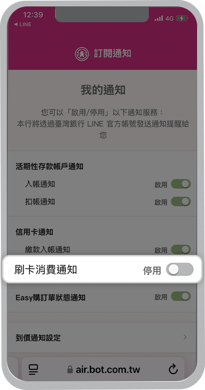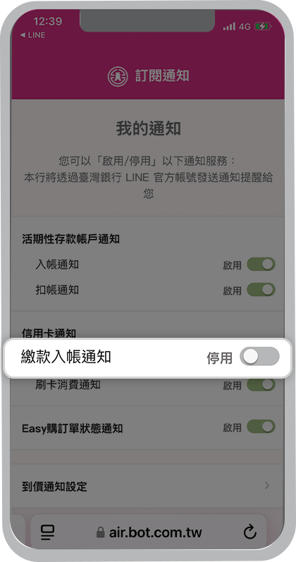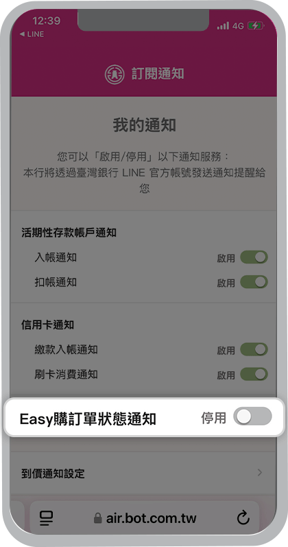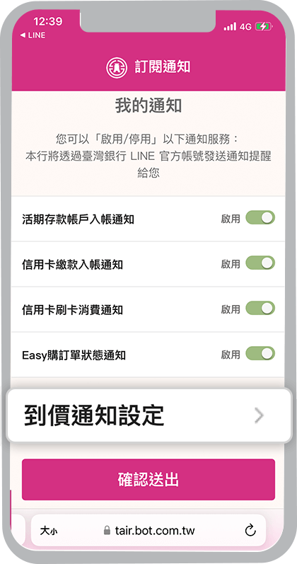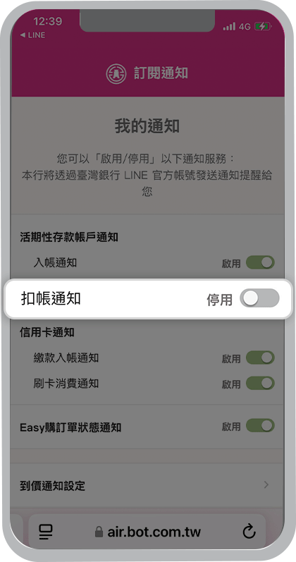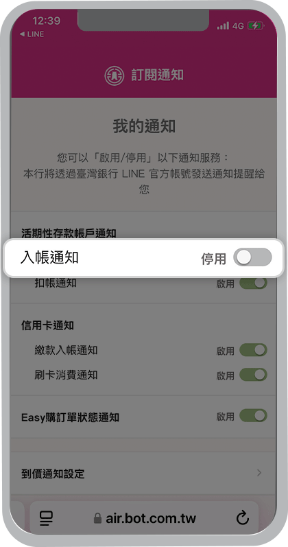 我想收到臺灣銀行LINE官方帳號的個人化通知,要從哪裡設定?