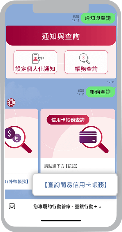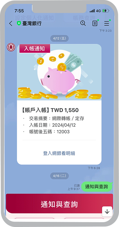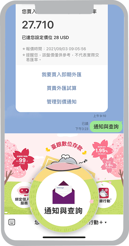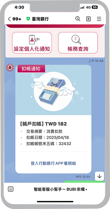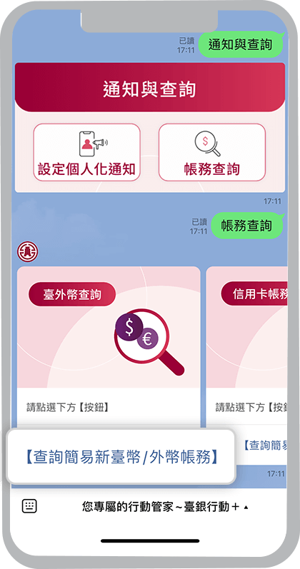 在臺灣銀行LINE官方帳號選單,點選「通知與查詢」,再選擇「設定個人化通知」,再依畫面指示操作即可設定通知內容。