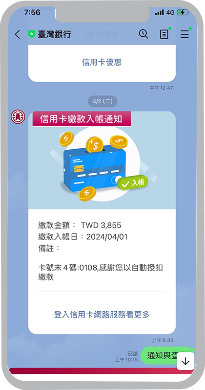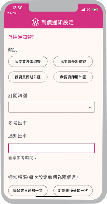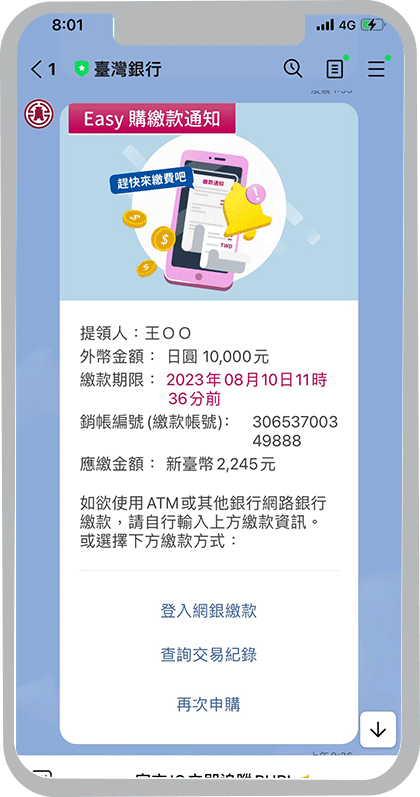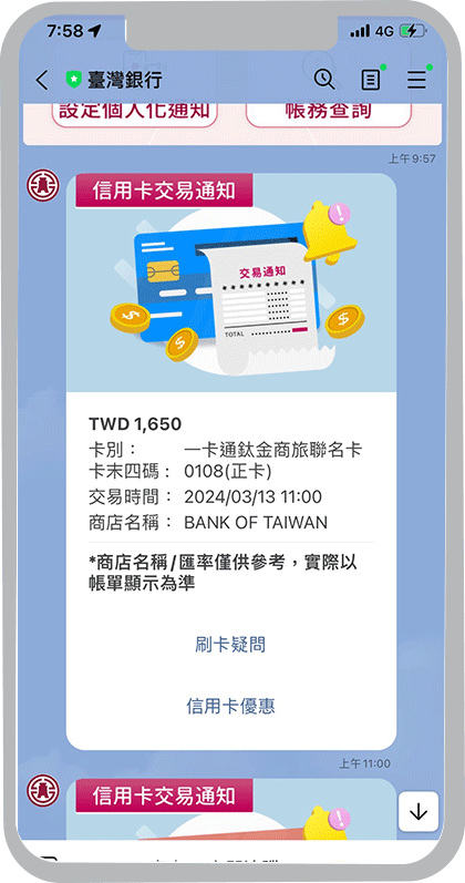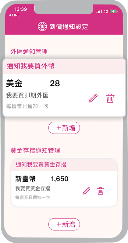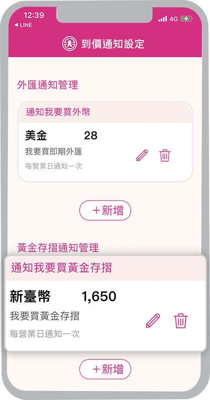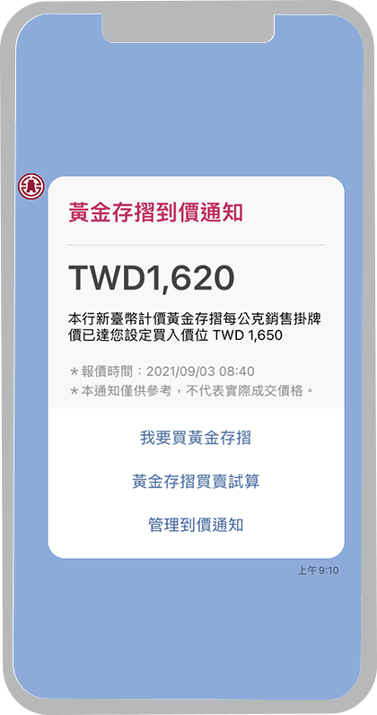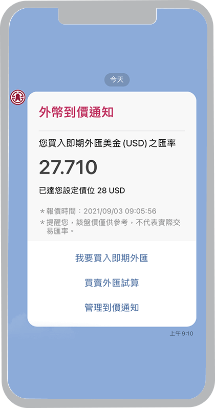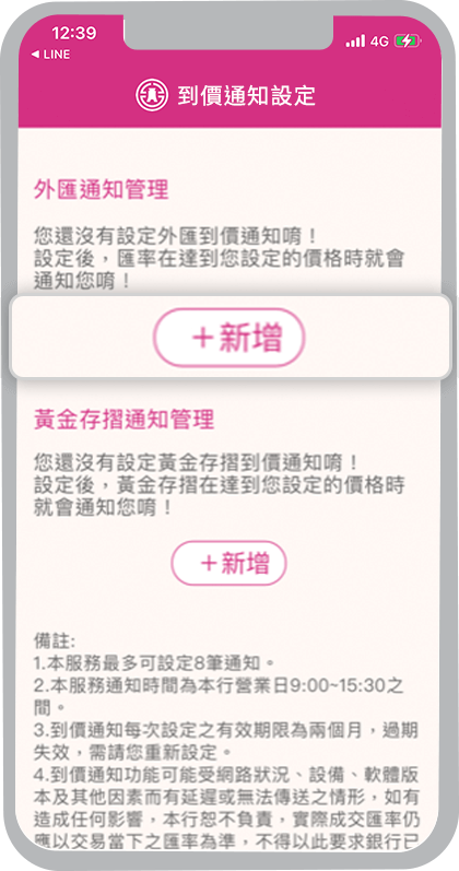 外匯牌告匯率到價通知、黃金存摺牌價到價通知、活期性存款帳戶入帳通知、活期性存款帳戶扣帳通知、信用卡繳款入帳通知、信用卡刷卡消費通知及Easy購訂單狀態通知,新通知項目將陸續上線,敬請期待。